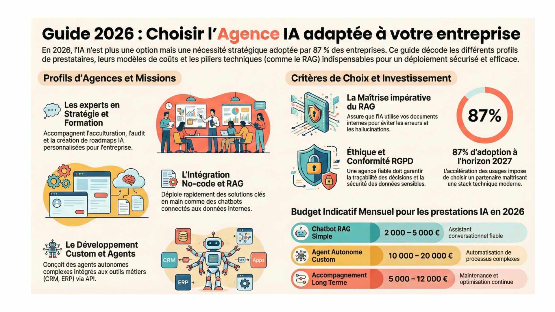 Agence IA en 2026 : définition, tarifs, profils d’agences, RAG, agents autonomes et critères clés pour choisir la solution adaptée.