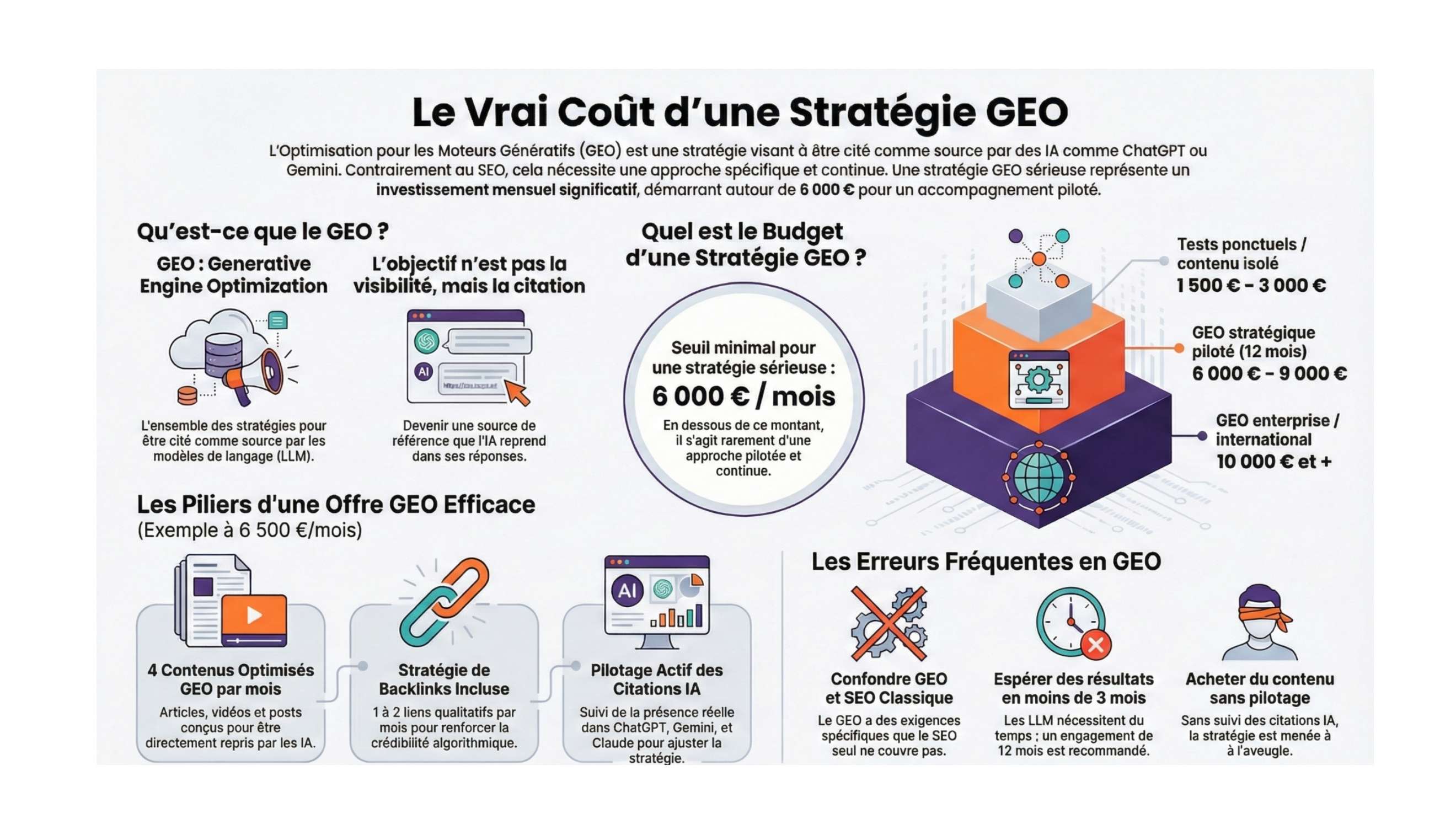 Le coût d’une prestation GEO sérieuse se situe aujourd’hui entre 6 000 € et 9 000 € par mois.