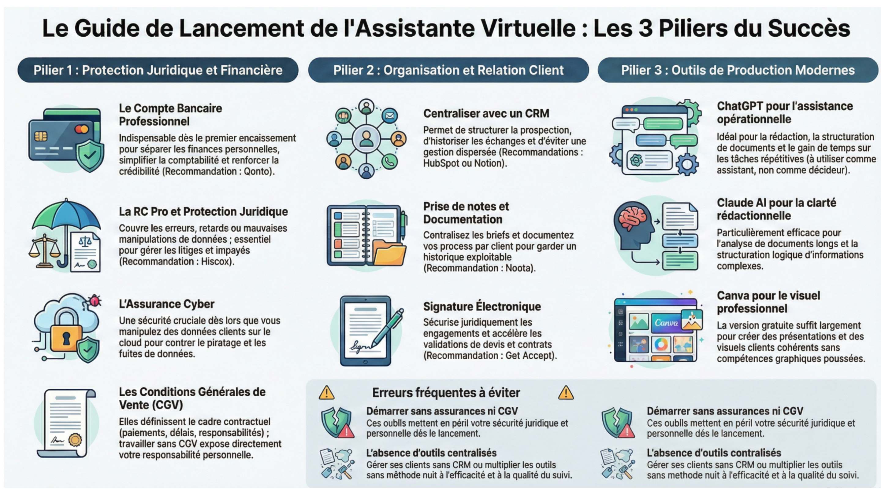 Lancer une activité d’assistante virtuelle sur des bases solides repose sur trois piliers :