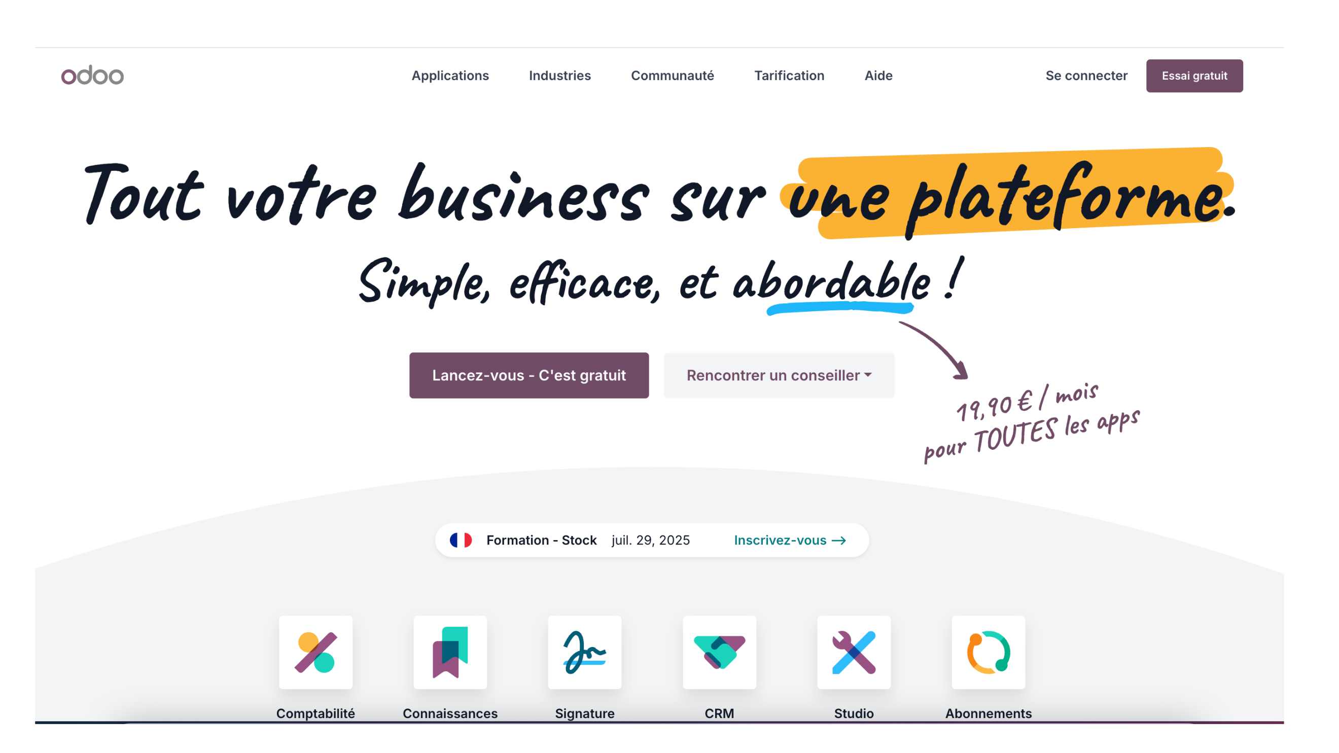 Odoo propose aussi une version gratuite si vous n’utilisez qu’une seule application métier (par exemple CRM, facturation ou inventaire). Les modules nécessaires au fonctionnement de cette app sont inclus.