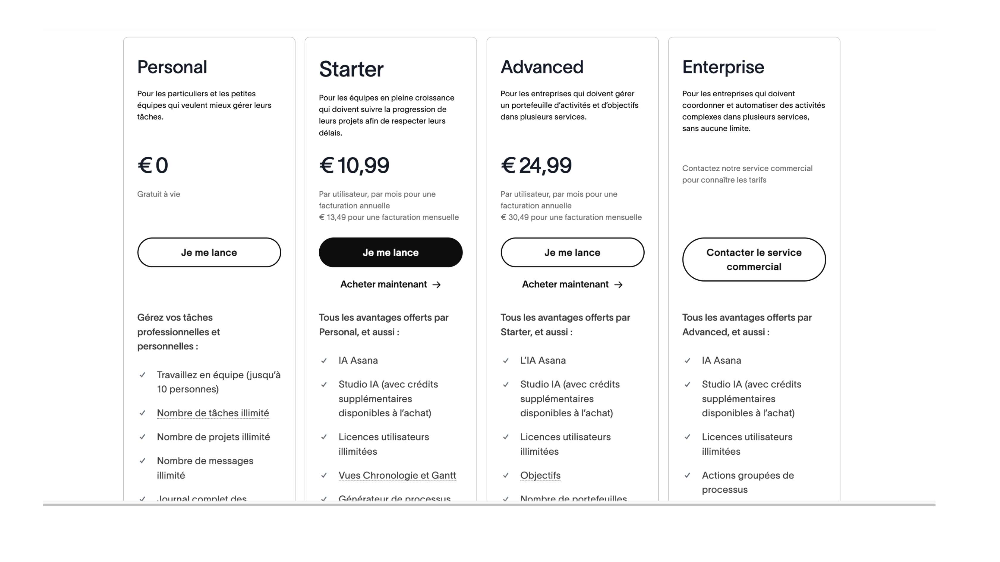 | Personal | 0 € | 1 à 10 | Tâches illimitées, vues liste/tableau, intégrations de base |