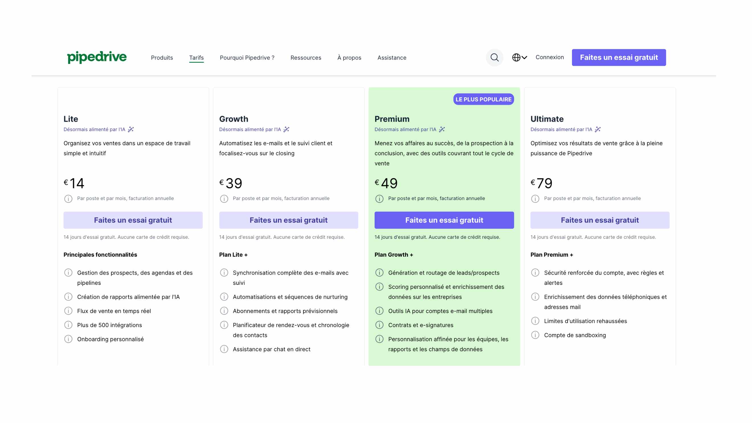 Lite | 14 € | Gestion prospects, agendas et pipelines • Rapports IA • Flux de vente temps réel • 500+ intégrations • Onboarding personnalisé |