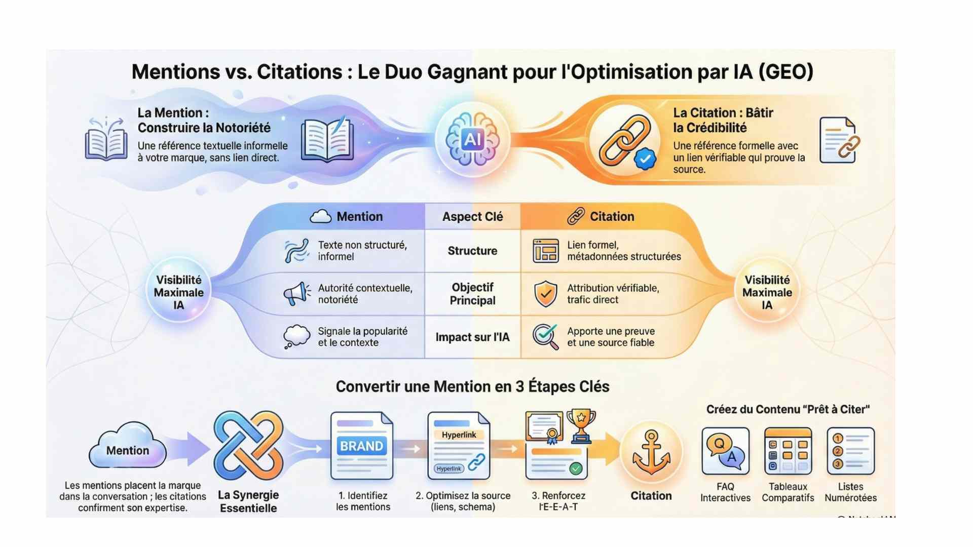 → Une stratégie GEO optimise les contenus pour être mentionnés ou cités par les IA génératives.