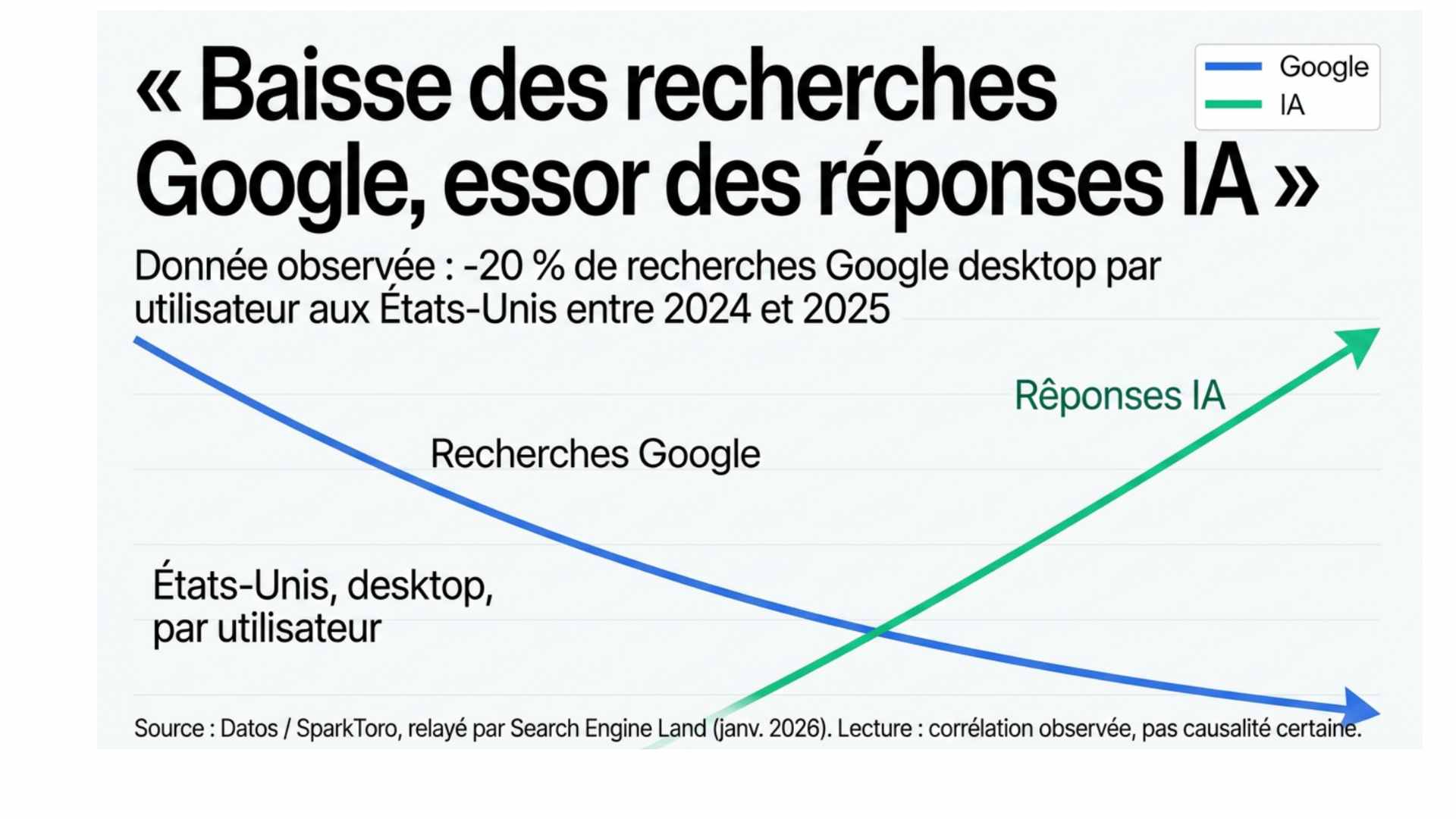 Gartner et JPMorgan convergent sur un même pronostic : une baisse de 25 % du trafic search traditionnel d’ici fin 2026. Ce n’est plus une hypothèse — c’est un consensus de marché.