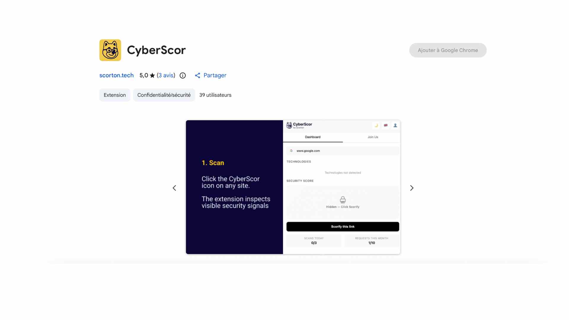 En téléchargeant l'extansion Chrome gratuite, on entre l'URL de notre site web ou celui d'un partenaire commercial et on évalue le 1er niveau de cyber risque lié à notre activité.