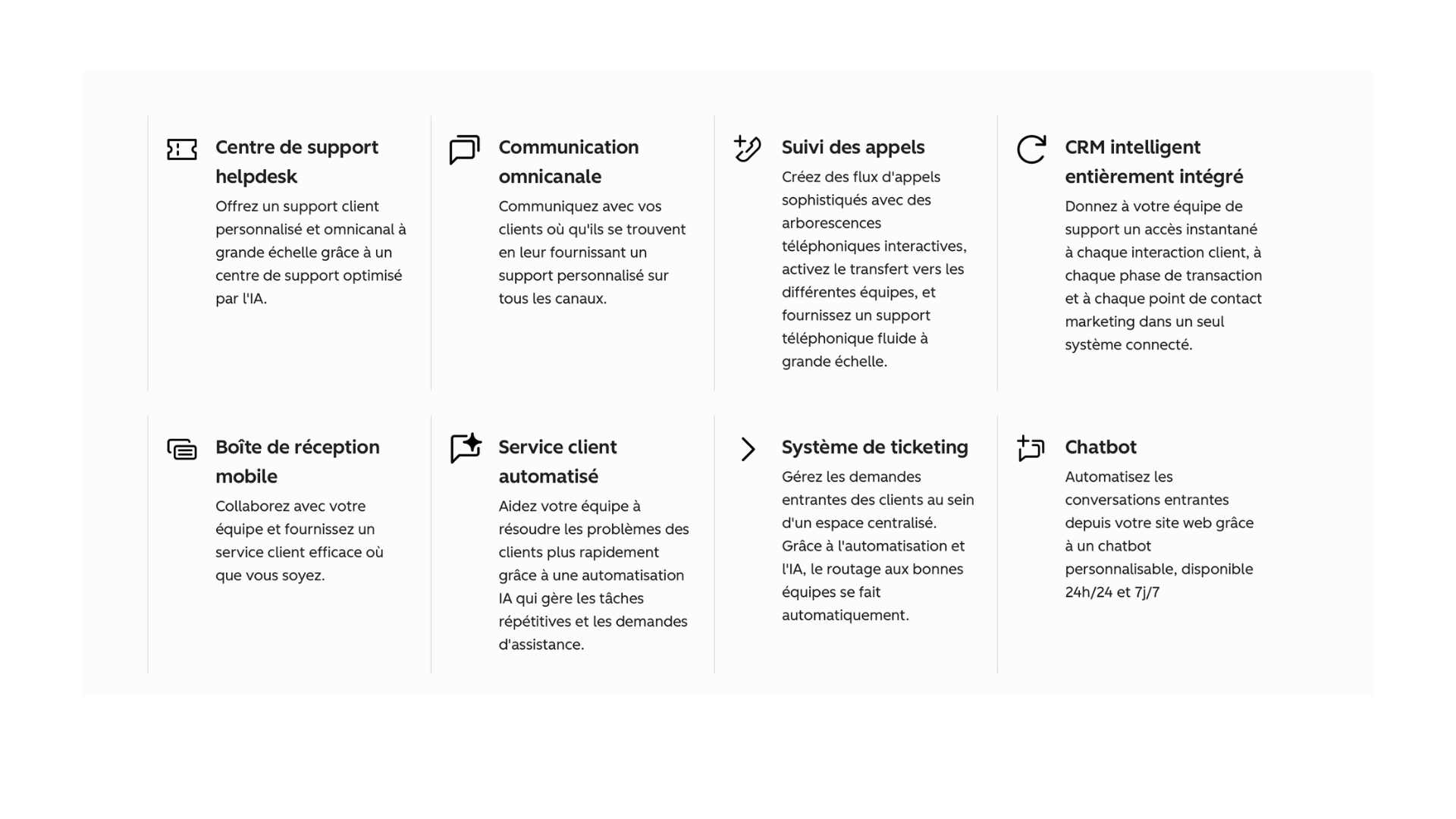 Contextualisation native : chaque ticket montre l’historique client instantanément.