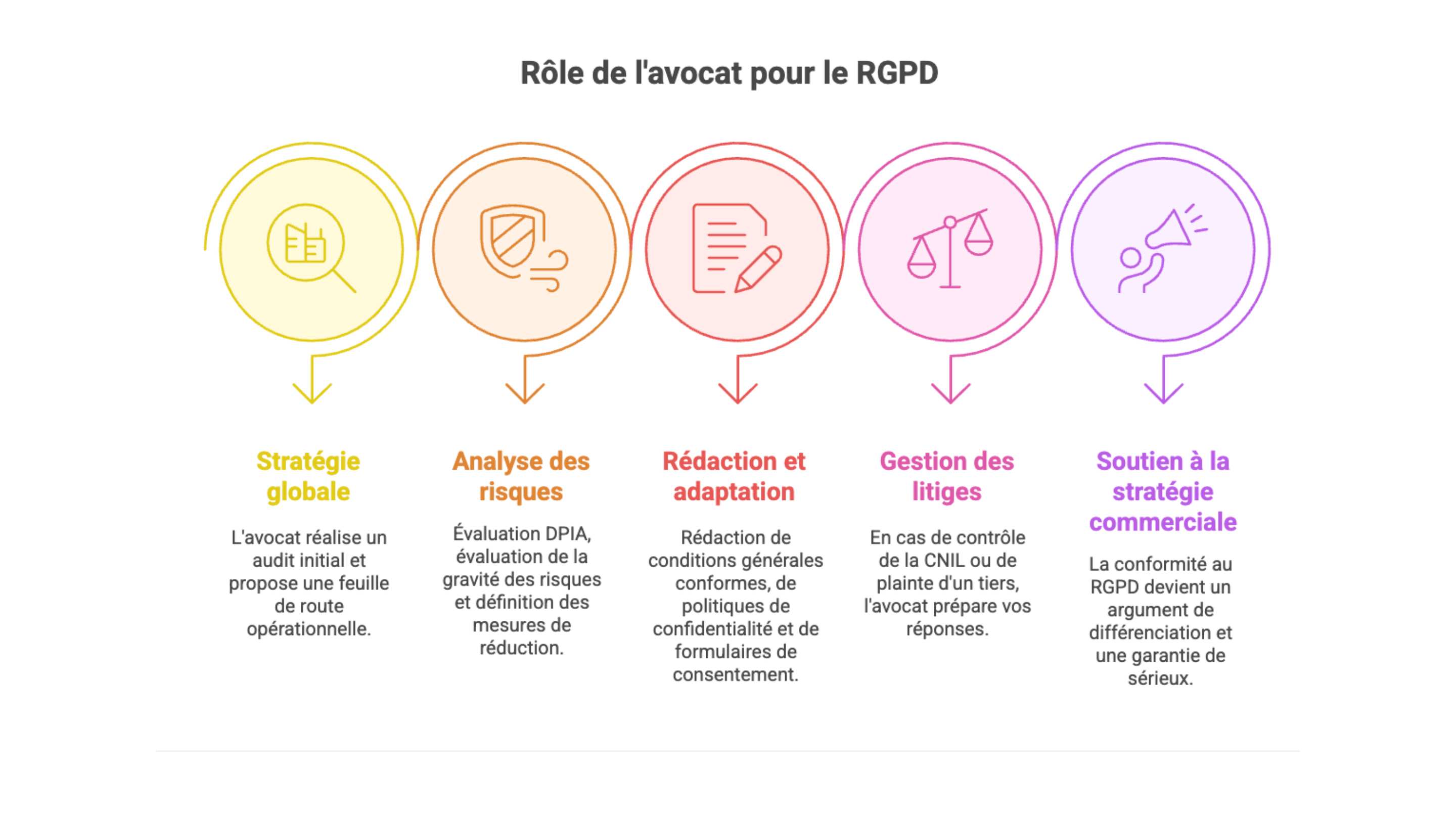 L’avocat réalise un audit initial (compendium des traitements, conformité des CGV, cookies, mentions légales…), puis propose une feuille de route opérationnelle (calendrier, priorisation)