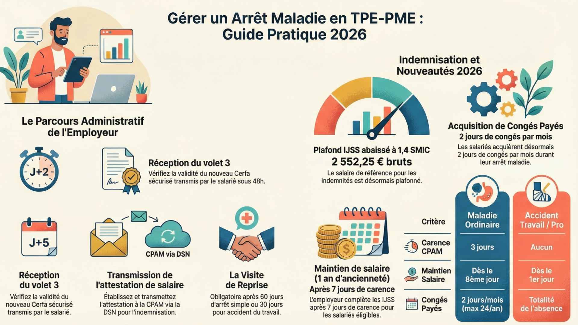 Ce guide couvre l’intégralité du processus : réception de l’arrêt, attestation de salaire, calcul du maintien de salaire et des IJSS, contre-visite médicale, gestion de l’absence dans l’équipe, visite de reprise, et recours possibles. Toutes les règles sont à jour des évolutions 2025-2026, notamment l’abaissement du plafond d’indemnisation à 1,4 SMIC et le nouveau formulaire Cerfa sécurisé.
