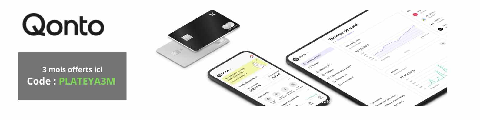| Qonto | 3 mois offerts | Actuellement actif | Code promo PLATEYA3M |