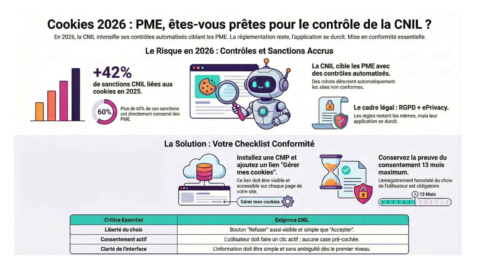 En 2026, les règles ne changent pas mais leur application se durcit. La CNIL utilise désormais des robots pour détecter automatiquement les sites non conformes.