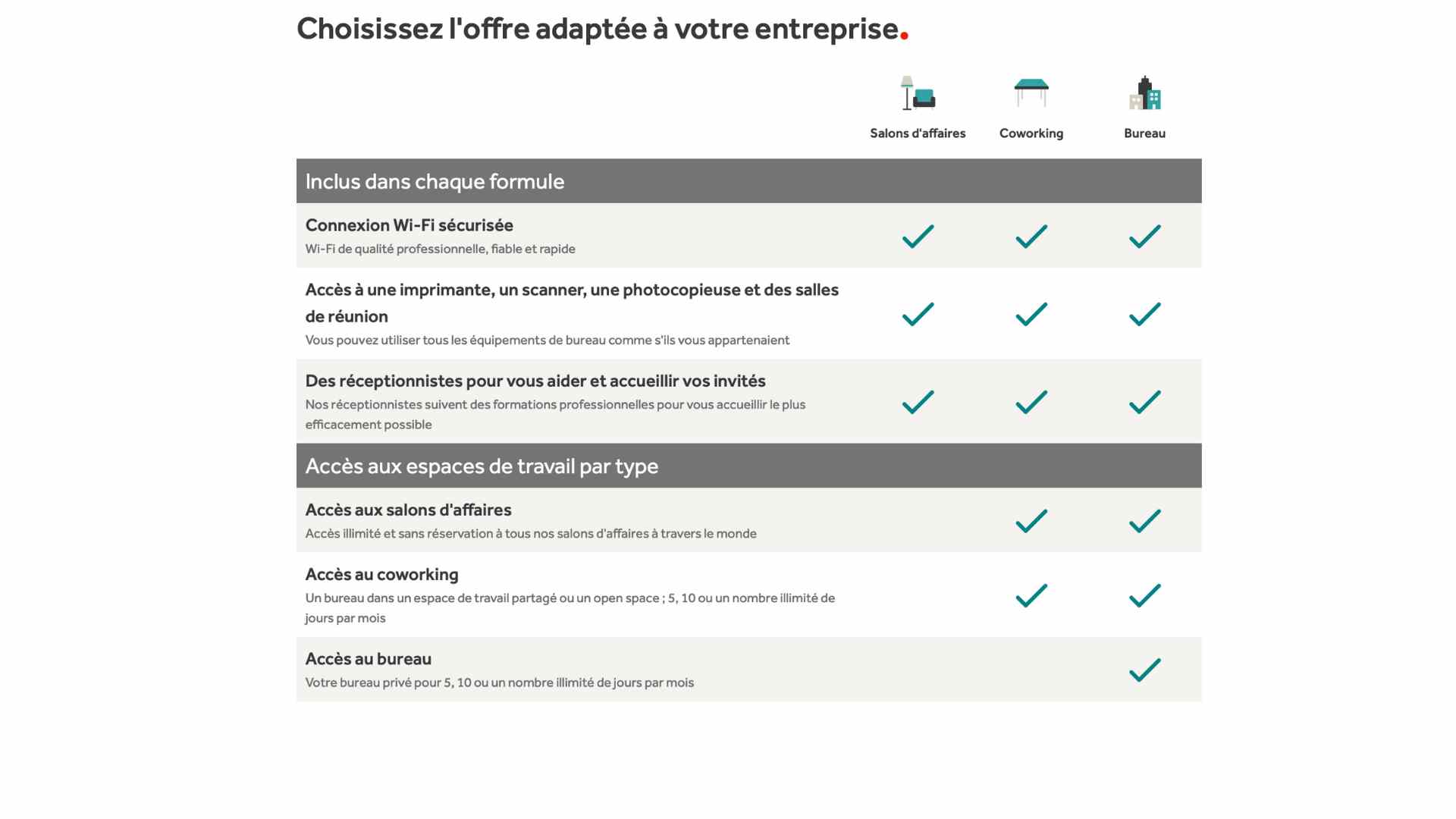 Conclusion : Regus est adapté aux entreprises recherchant une adresse haut de gamme et une présence internationale, mais son prix est 20 à 40 % plus élevé que la moyenne du marché.