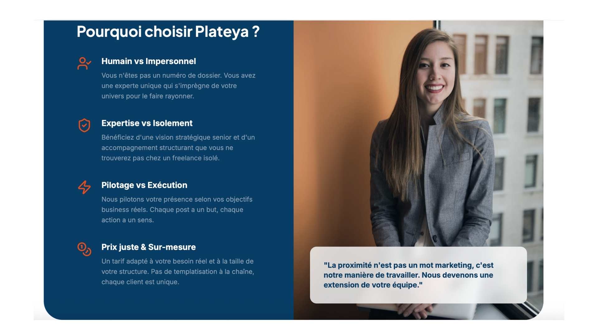 Plateya se distingue des marketplaces généralistes par son positionnement d'écosystème collaboratif haut de gamme. Nous ne sommes pas un simple annuaire, mais un partenaire de confiance pour les entreprises exigeantes.