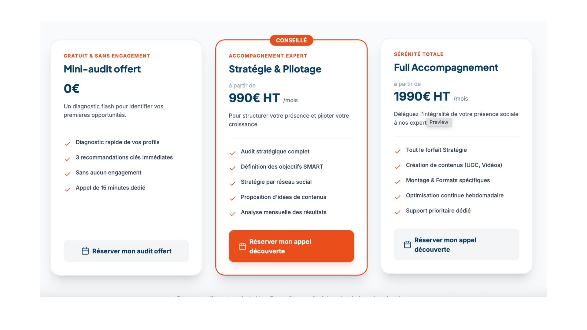 Cette absence de commission favorise une relation saine et durable. L'expert, correctement rémunéré pour son travail de création, de montage ou de gestion publicitaire, s'investit davantage dans la réussite de votre projet. Pour l'entreprise cliente, cela se traduit par des tarifs compétitifs pour un niveau de séniorité élevé, sans la surcharge des frais d'intermédiation classiques. Nous couvrons tous les types de besoins : de la création de vidéos UGC (User Generated Content) à la gestion complète de votre compte entreprise, en passant par l'optimisation de vos campagnes d'acquisition payante.