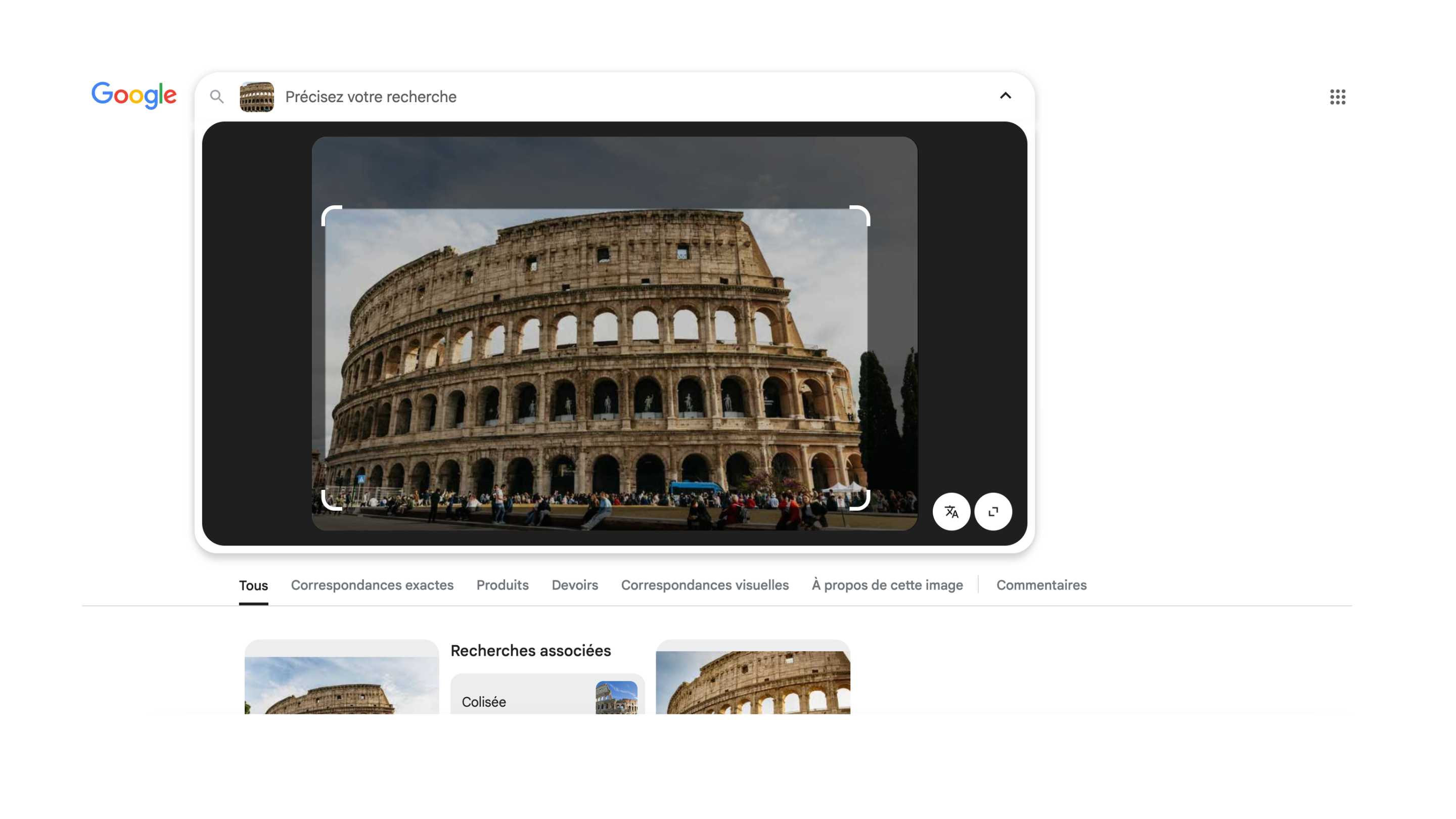 Ici nous avons pris l'exemple d'une photo du Colisée. L'image sans nom a été téléchargée dans Google Lens qui repère automatiquement le nom et les recherchées associées grâce à son IA.