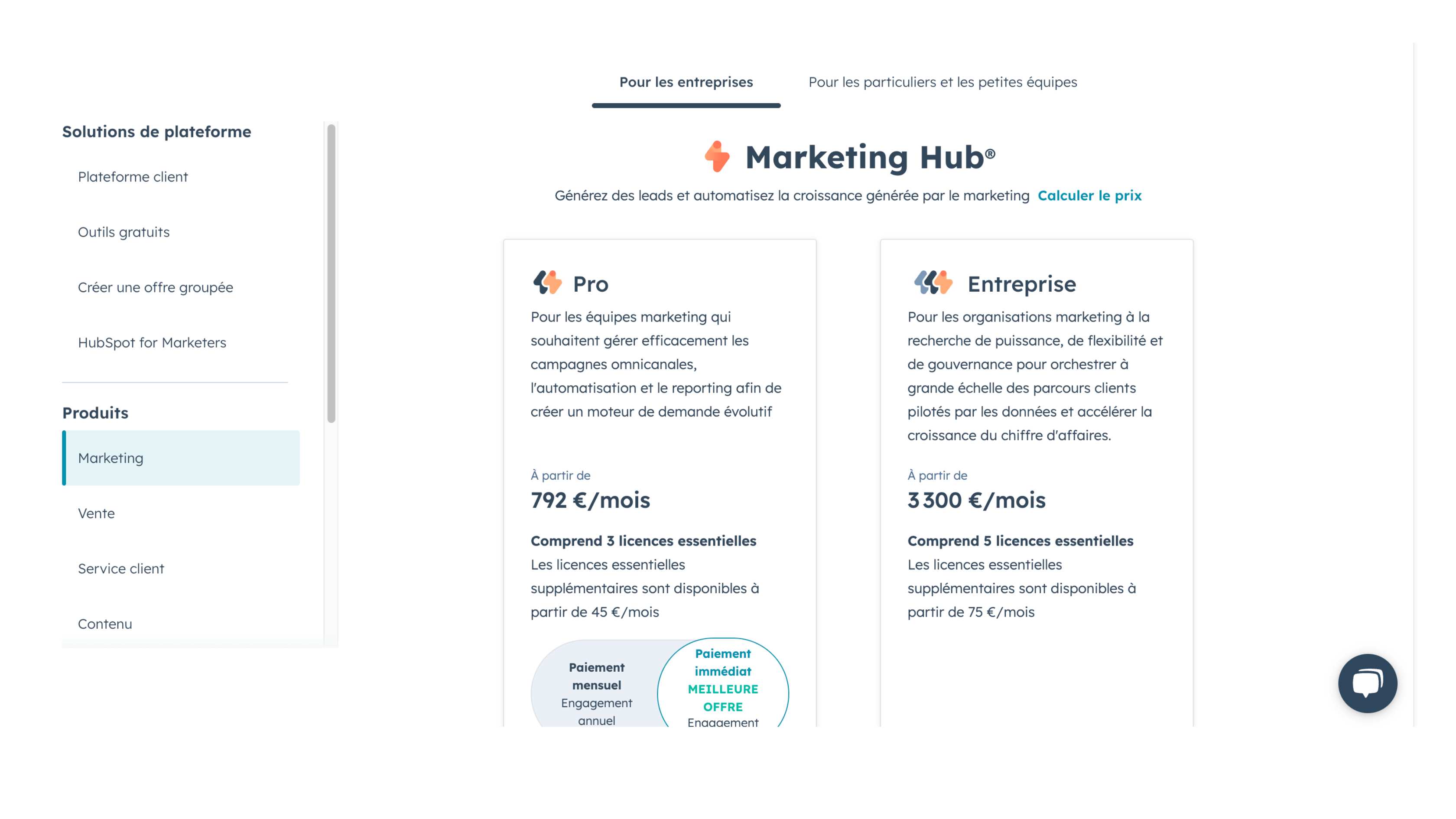 HubSpot fonctionne par Hubs, niveaux de service (Gratuit, Starter, Pro, Entreprise), et sièges utilisateurs. Les prix évoluent rapidement à mesure que vous grandissez.