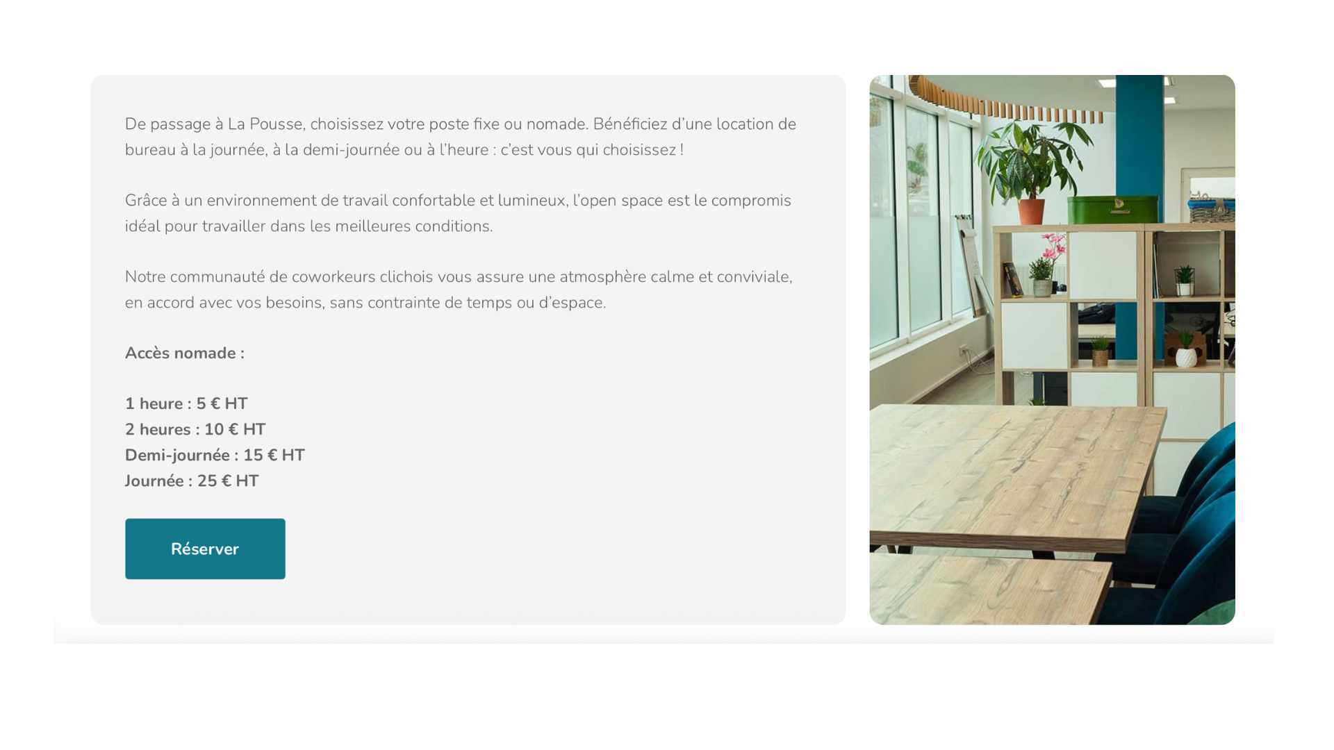 - Open-space nomade : 5 €/h → 25 €/journée (pack 10 jours : 130 €/mois)
