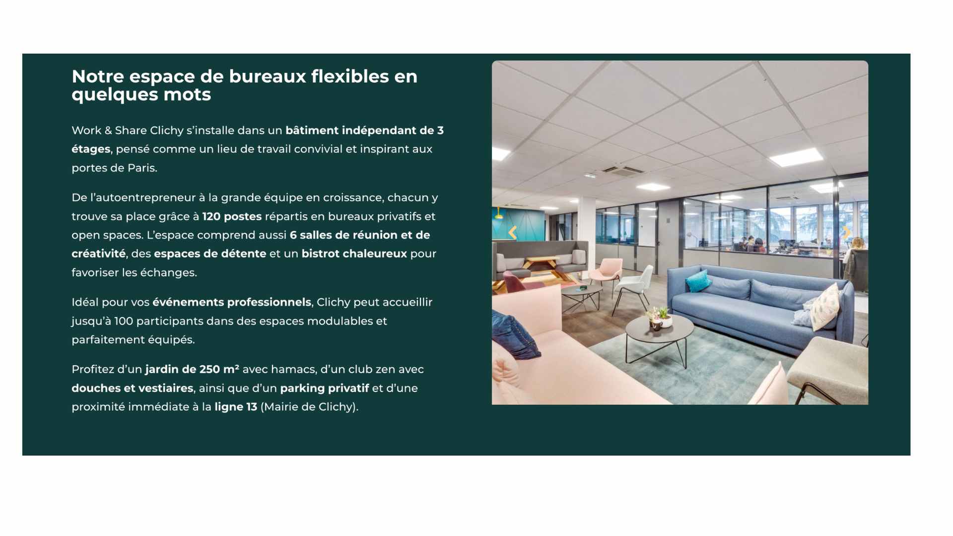 - Aménités (wifi fibre, salles réunion, café illimité, événements)