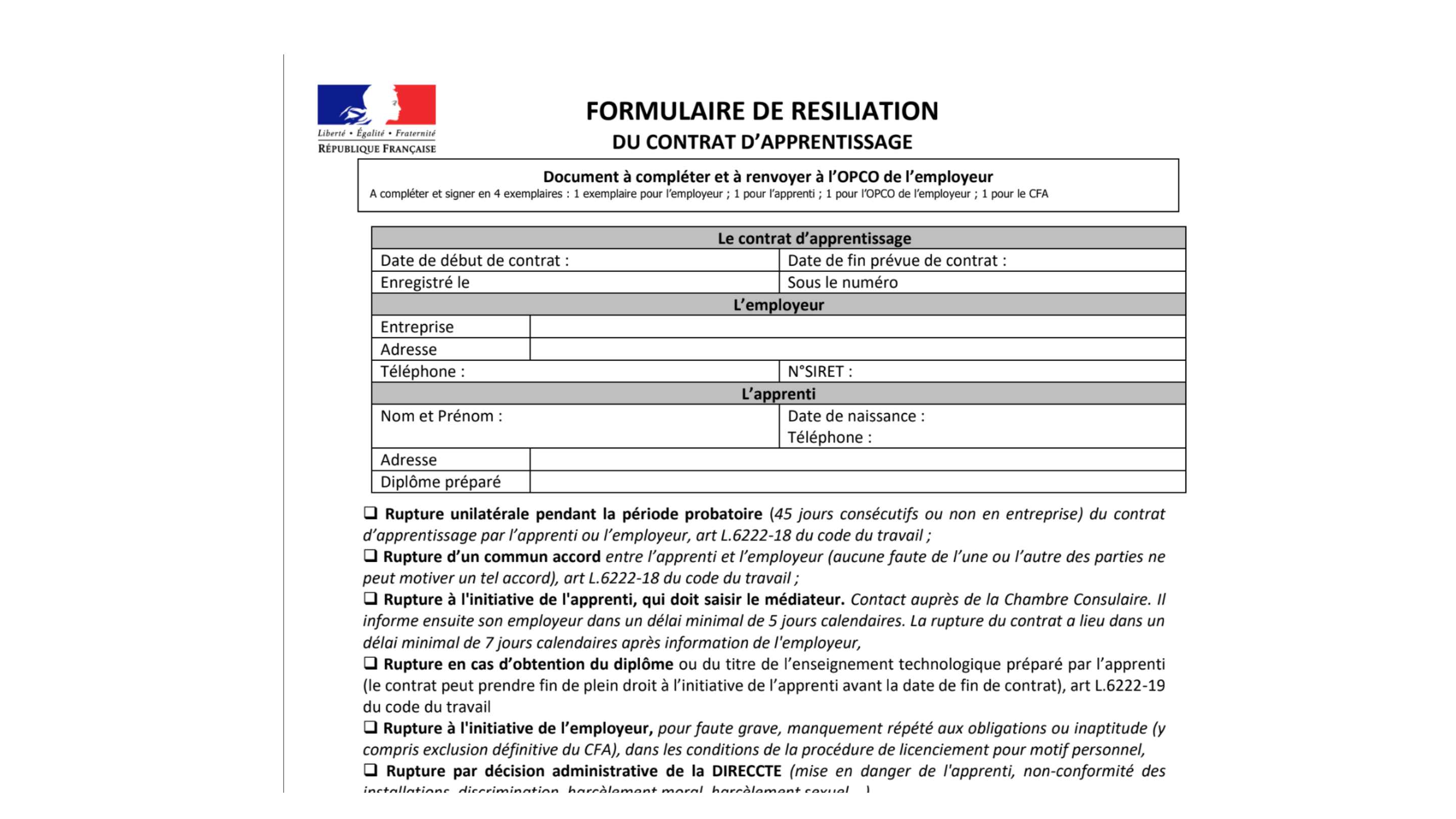 Voir ci-dessous le formualaire de rupture du contrat d'apprentissage
