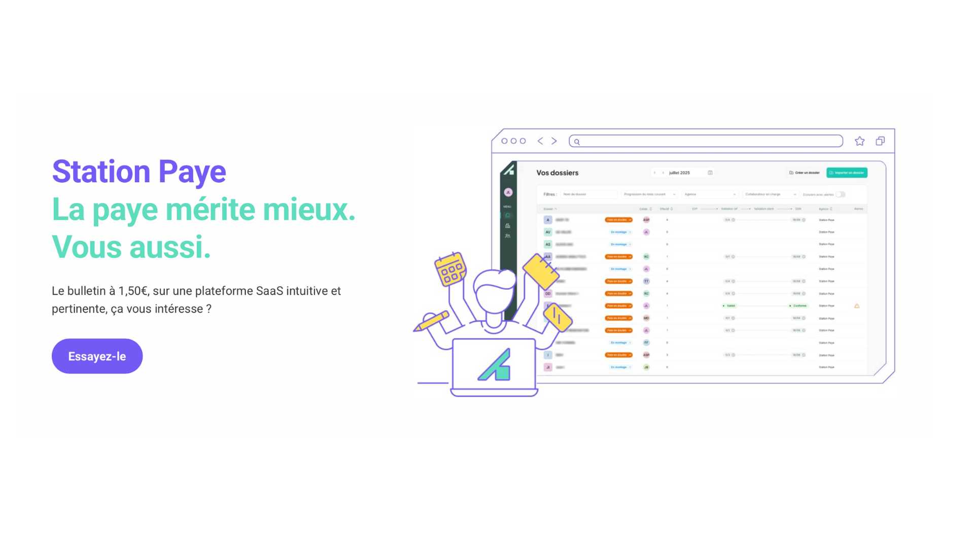 Station Paye est une plateforme de paie SaaS qui propose un bulletin tout-inclus à 1,50 €, sans frais cachés, avec un montage de dossier en 5 minutes et +30 % de productivité mesurée. Pensée par des experts-comptables et des spécialistes tech, elle casse un modèle tarifaire opaque et complexe devenu intenable.