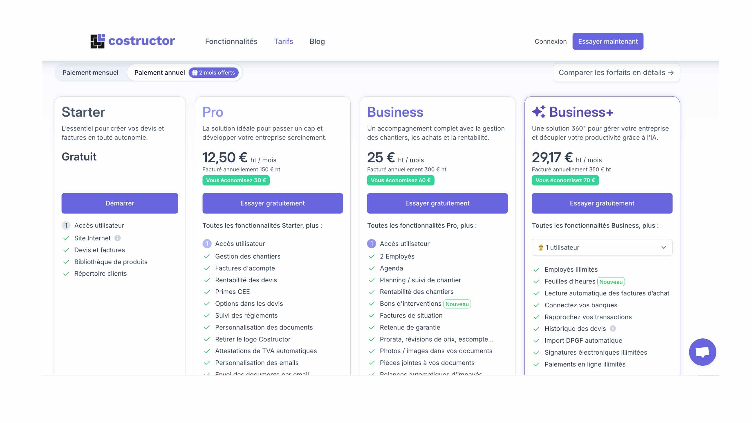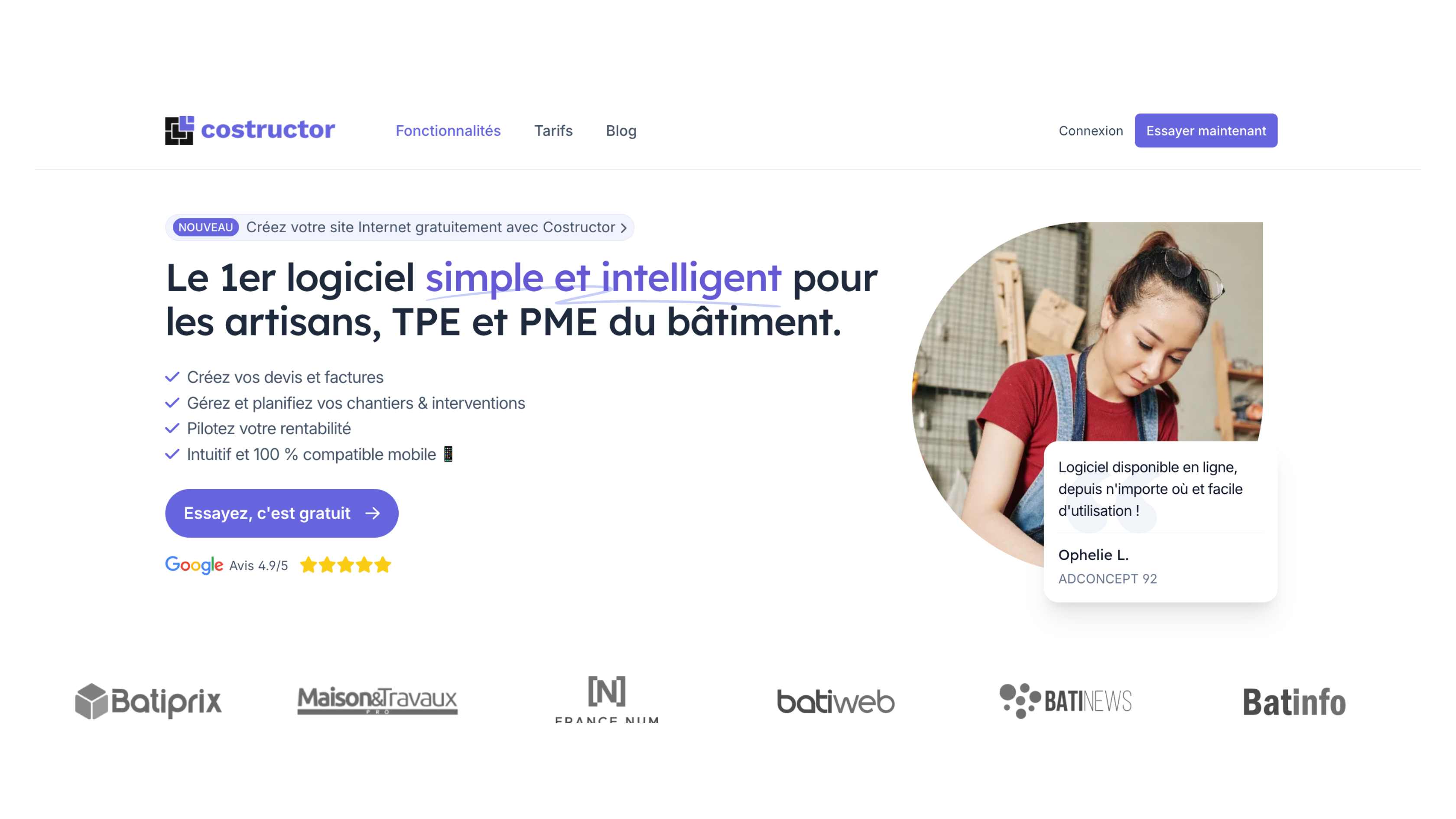 | Costructor | Artisans | Gratuit à 10 € | Rentabilité, support, mobile |
