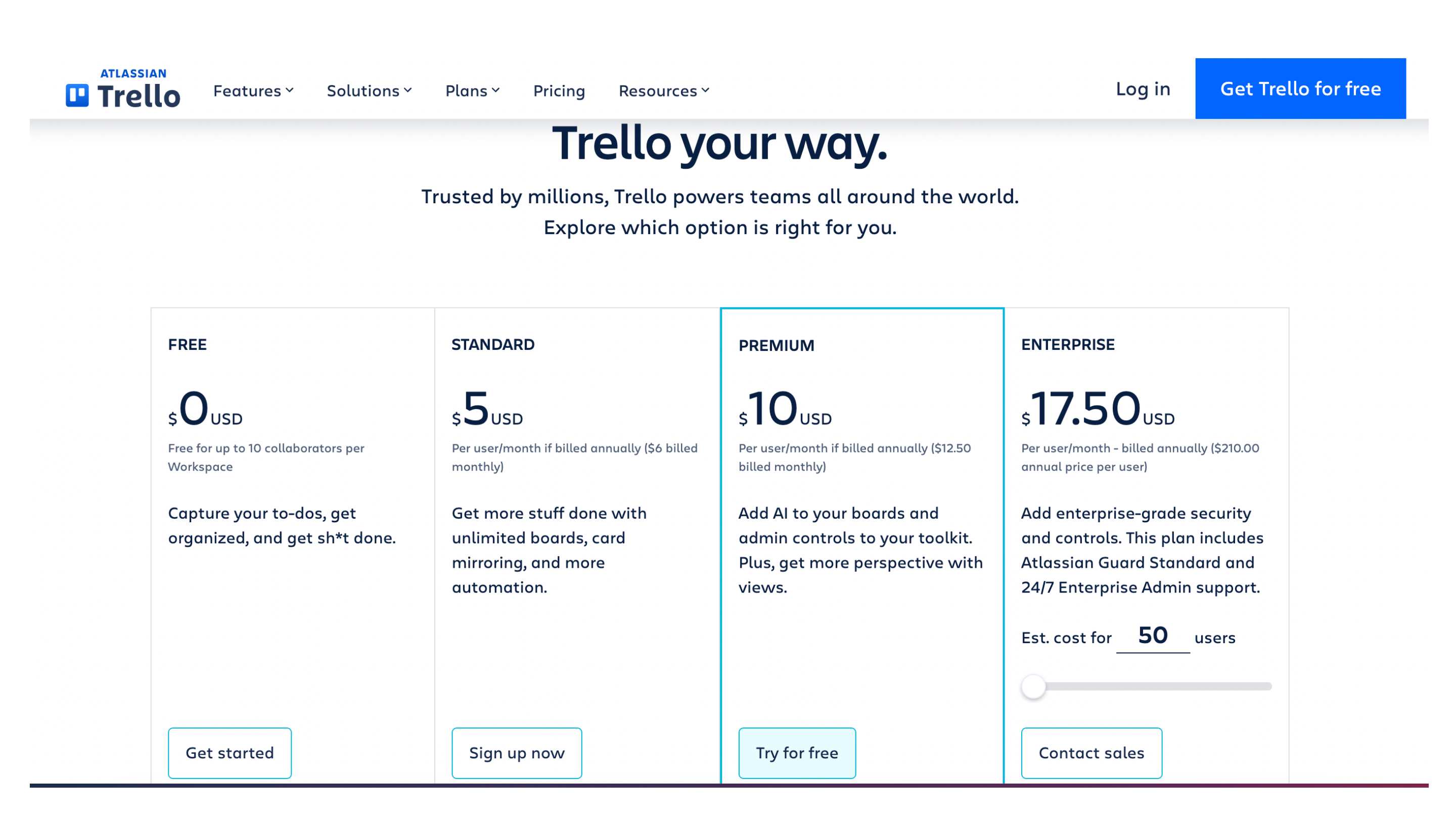 Trello propose plusieurs plans tarifaires, adaptés aux besoins des utilisateurs individuels, des PME et des grandes entreprises. Voici les prix principaux relevés pour l’année 2024-2025 :
